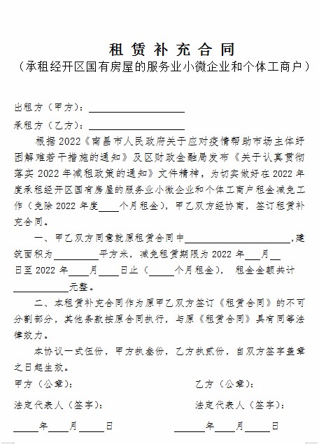 為認(rèn)真貫徹《南昌市人民政府關(guān)于應(yīng)對(duì)疫情幫助市場(chǎng)主體紓困解難若干措施的通知》(洪府發(fā)【2022】15號(hào))文件精神,根據(jù)區(qū)財(cái)政金融局發(fā)布《關(guān)于認(rèn)真貫徹落實(shí)2022年減租政策的通知》,結(jié)合經(jīng)開(kāi)區(qū)實(shí)際,落實(shí)承租經(jīng)開(kāi)區(qū)域內(nèi)國(guó)有房屋的服務(wù)業(yè)小微企業(yè)和個(gè)體工商戶,2022年減免三個(gè)月租金,確保減免租金惠及最終承租人。現(xiàn)將實(shí)施細(xì)則通知如下: