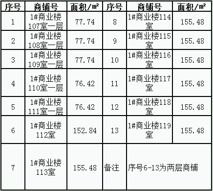 | 序號 | 商鋪號 | 面積/㎡ | 序號 | 商鋪號 | 面積/㎡ | 序號 | 商鋪號 | 面積/㎡ |