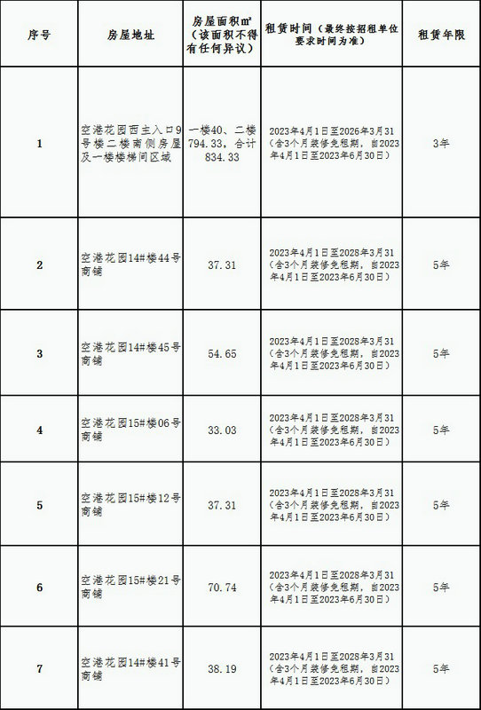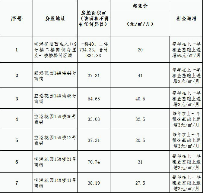 八、中標(biāo)人及直接委托人定義:每一個競拍周期報名結(jié)束后,有三個及以上報名人,將按照本公告規(guī)定的競拍規(guī)則進(jìn)行公開競拍;當(dāng)報名人數(shù)少于3人,則本次招租失敗。若連續(xù)二次招租失敗,在第三次競拍報名期間(累計前2次)只有2人報名時,經(jīng)招租人批準(zhǔn)后,可采取現(xiàn)場比價方式,但不得低于招租底價;若只有1人報名時,經(jīng)招租人批準(zhǔn)后,可采取直接委托方式,委托租金單價空港花園西主入口9號樓二樓南側(cè)房屋及一樓樓梯間區(qū)域為20元/㎡/月;空港花園14#樓44號商鋪為41元/㎡/月;空港花園14#樓45號商鋪為40.5元/㎡/月;空港花園15#樓06號商鋪為32.5元/㎡/月;空港花園15#樓12號商鋪為20.5元/㎡/月;空港花園15#樓21號商鋪為31元/㎡/月;空港花園14#樓41號商鋪為27.5元/㎡/月。本次競拍只承認(rèn)第一中標(biāo)人,不按排名順延中標(biāo)人權(quán)利。