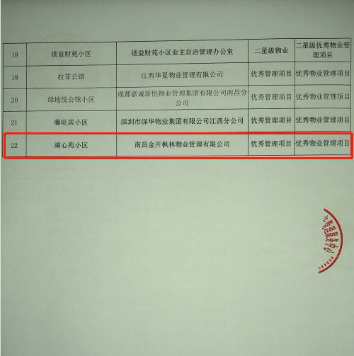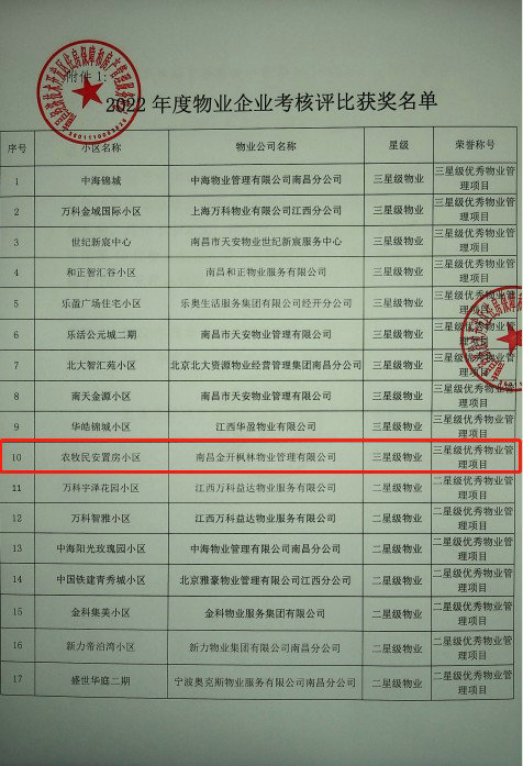 2月14日,南昌經濟技術開發區住房保障和房產管理服務中心發布《關于對2022年度經開區物業服務企業進行表彰的決定》文件,南昌金開楓林物業管理有限公司榮獲“三星級物業”和“優秀管理項目”榮譽稱號!