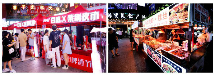 不僅演出精彩紛呈,現(xiàn)場(chǎng)還設(shè)立了多個(gè)啤酒品牌攤位,設(shè)置了啤酒競(jìng)飲比拼和多種互動(dòng)游戲。流動(dòng)攤車一字排開,人頭攢動(dòng),各種風(fēng)情美食,攤前排起長隊(duì),年輕人呼朋喚友……大家在熱烈的節(jié)日氛圍中,邊吃邊看、邊喝邊玩,燈火交錯(cuò)中,感受著城市的動(dòng)感與活力。